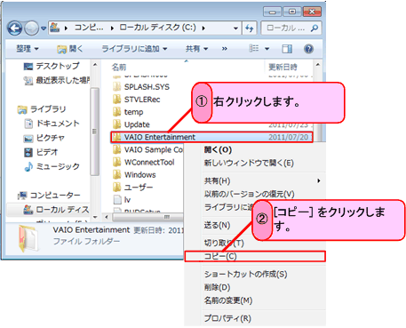 - コンテンツ保存先のドライブにある[VAIO Entertainment]フォルダーを右クリックし、[コピー]をクリックします。