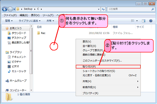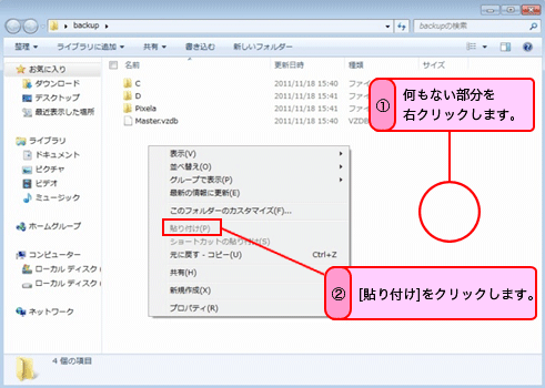 - 「手順5 バックアップデータを保存するフォルダーを作成します」で作成した[backup]フォルダーを開き、何もない部分で右クリックし、[貼り付け]をクリックします。