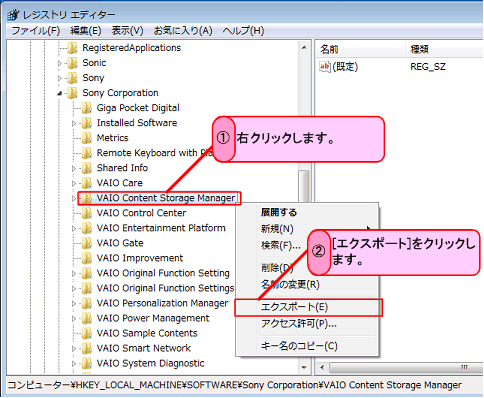 - [VAIO Content Storage Manager]フォルダーを右クリックし、[エクスポート]をクリックします。