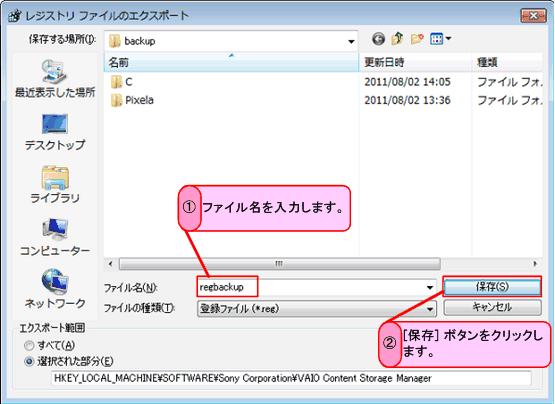 - [レジストリ ファイルのエクスポート]画面が表示されるので、作成した[backup]フォルダーを保存する場所に指定して、「regbackup」というファイル名を入力し、[保存]ボタンをクリックします。