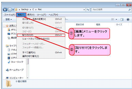 - [編集]メニューをクリックし、[貼り付け]をクリックします。