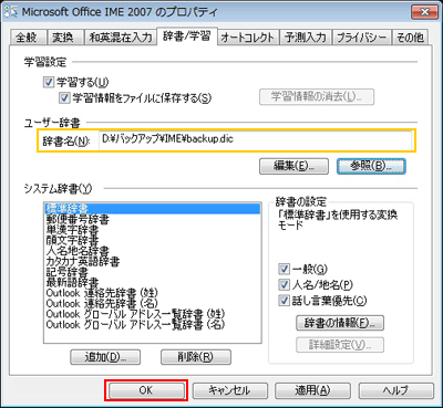 - [ユーザー辞書]の[辞書名]欄に選択したファイルが表示されていることを確認し、[OK]ボタンをクリックします。