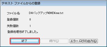 - 一括登録が終了し、[テキスト ファイルからの登録]画面が表示されるので [終了]ボタンをクリックします。