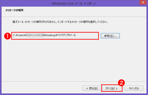 - 「フォルダーの参照」画面が表示されるので、デスクトップ上にコピーした「バックアップ」フォルダーの中にある、「メール」フォルダーを選択し、[OK]を選択します。
