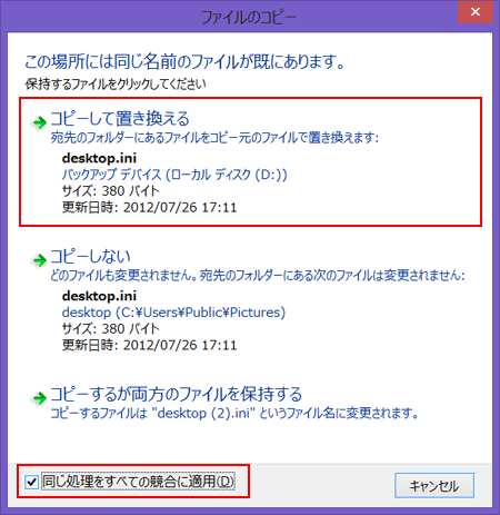 [同じ処理をすべての競合に適用]にチェックをつけ、[コピーして置き換える]を選択します。