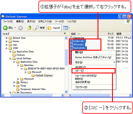 - 保存フォルダ内の拡張子が「dbx」のファイルを全て選択し、右クリックして [コピー] をクリックします。