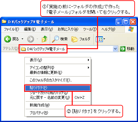 - 先に作成した「電子メール」フォルダをダブルクリックして開き、右クリックして [貼り付け] をクリックします。