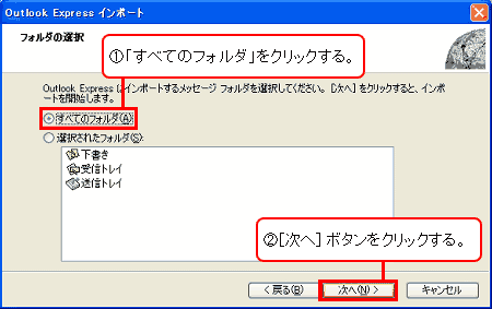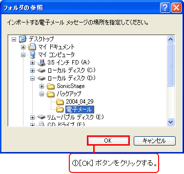 この説明では、「バックアップフォルダ」の中の「電子メール」フォルダを選択することにしますが、複数のユーザーでお使いの場合は、自分のメッセージを保存したフォルダを間違えずに選択しましょう。