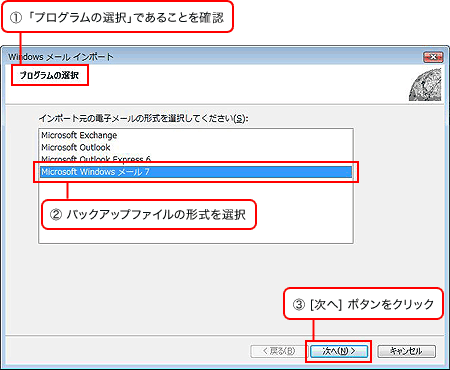 「バックアップ方法」の手順でバックアップした「送受信したメール」を「Windows メール」に復元する方法を紹介します。