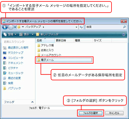 - * ここでは例として、あらかじめバックアップしたリムーバブルディスク内の [電子メール] フォルダを選択します。