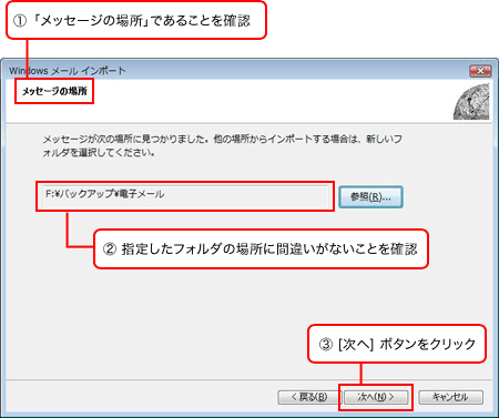 - 「メッセージの場所」ウィンドウに戻るので、指定したフォルダの場所に間違いがないことを確認し、 [次へ] ボタンをクリックします。