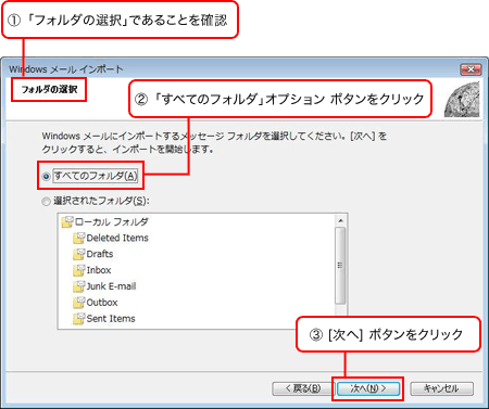 - 「フォルダの選択」ウィンドウが表示されるので、「すべてのフォルダ」オプション ボタンをクリックし、[次へ] ボタンをクリックします。