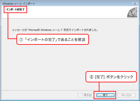 - 「インポートの完了」ウィンドウが表示されるので、[完了] ボタンをクリックします。