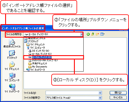 - 「インポートするアドレス帳ファイルの選択」ウィンドウで、「ファイルの場所」プルダウン メニューから [ローカル ディスク(D:)] をクリックします。