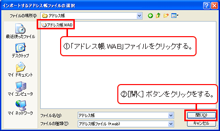 - 「アドレス帳 .WAB」ファイルをクリックし、[開く] ボタンをクリックします。