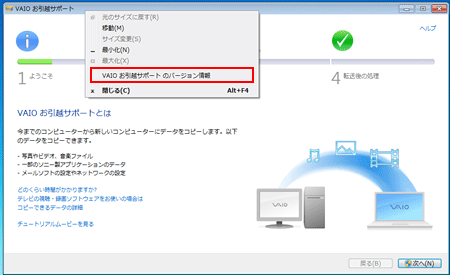 - 表示されたメニューから、「VAIO お引越サポートのバージョン情報」をクリックします。