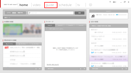 - VAIO TV with nasne™を起動して、[guide]をクリックします。