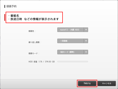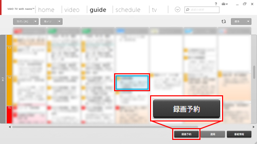 - 番組表が表示されるので、録画したい番組をクリックし、[録画予約]ボタンをクリックします。