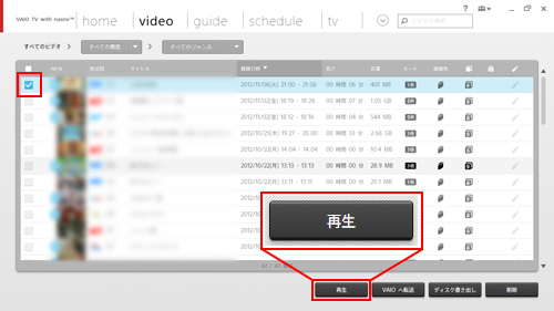 - 録画した番組一覧が表示されるので、再生したい番組をクリックし、左側のチェックボックスにチェックを入れ、[再生]ボタンをクリックします。