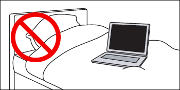 ノートパソコンを、やわらかい敷物(布団やじゅうたんなど)の上で使用したり放置したりすると、排気口・吸気口がふさがれて熱がこもり、火災の原因になる場合があります。そのような環境下では、絶対に使用しないでください。