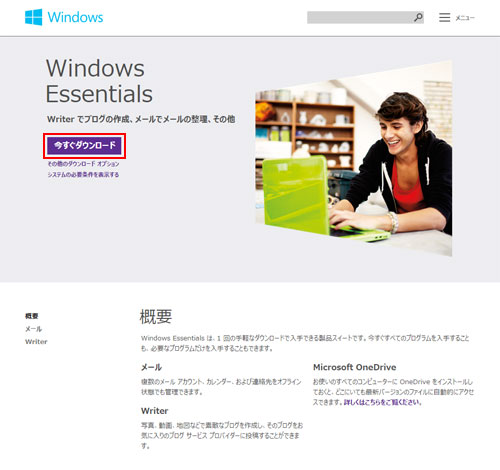 時期によってページの内容が異なる場合があります。同様のボタンが見つからない場合は、Windows Essentialsのダウンロードを行ってください。