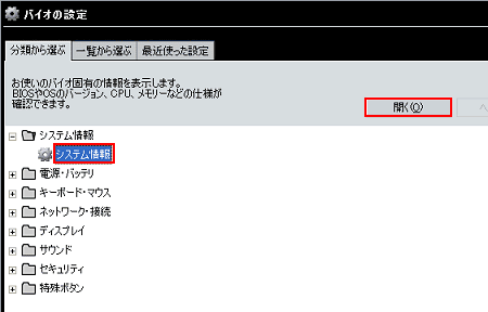 [分類から選ぶ] タブをクリックし、[システム情報] の [+] をクリックします。 - 表示された [システム情報] をクリックし、右上の [開く] ボタンをクリックします。