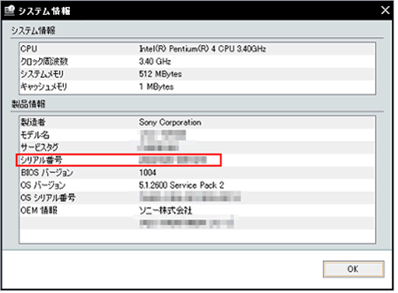 - [システム情報] 画面が表示されますので、[シリアル番号] を確認します。