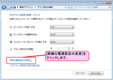 - [プラン設定の編集]画面が表示されるので、[詳細な電源設定の変更]をクリックします。