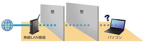 無線LAN機器を設置している部屋とは、コンクリート壁を隔てた違う部屋でパソコンを使用していたり、離れすぎていませんか?