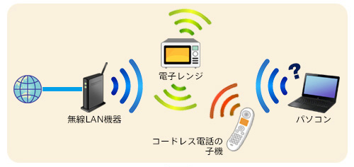 無線LAN機器やパソコンの近くに電子レンジや、コードレス電話の子機など電波を発信するものが置かれていませんか?