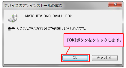 - 「デバイスのアンインストールの確認」画面が表示されるので、[OK]ボタンを選択します。