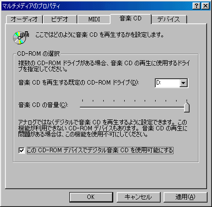PCGA-CDRW51/A付属のドライバーをインストール後、[マルチメディアのプロパティ]の[音楽CDタブ]をクリックし、「このCD-ROMデバイスでデジタル音楽CDを使用可能にする」にチェックをつける必要があります。 |