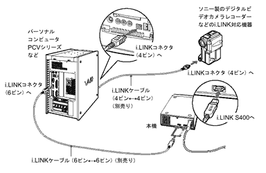 ソニー製 i.LINK ハードディスクとコンピューター1台、ソニー製のデジタルビデオカメラレコーダーなどの i.LINK 対応機器1台の接続