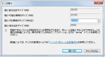 ただし、縮小可能な領域の最大サイズはシステムで決められているため、表示されているサイズよりC:ドライブをさらに小さく縮小することはできません。