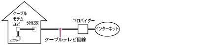 ケーブルテレビの回線を使ってインターネットに接続します。通信速度は事業者によって異なり、ADSLあるいは光(FTTH)と同程度で接続ができます。