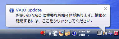 設定を終えると、「VAIO Update」はソニーのサーバーと定期的に通信して、お客様がご利用のVAIOに関する重要なお知らせや、プリインストールされているソフトウェアの「アップデートプログラム」があれば、以下のようにタスクトレイの「バルーン」で表示します。