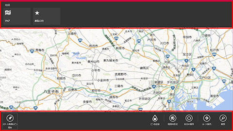例えば、「地図」アプリを使用中に、このキーを押すと、画面の上下に「地図」アプリに関連するメニューが表示されます。