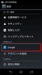 ①ホーム画面でをタップし、[設定]−[アカウントを追加]−[Google]をタップしてください。
