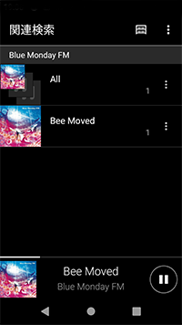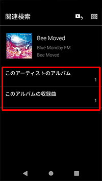 再生中の曲のアルバムから収録曲を探す「アルバム関連検索」 、再生中の曲のアーティストのアルバムを探す「アーティスト関連検索」の2つがあります。以下の手順を参考にしてください。