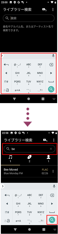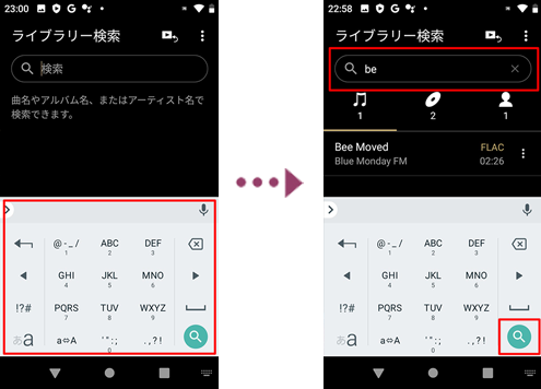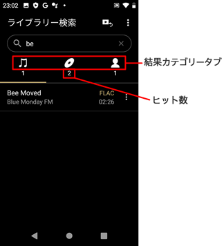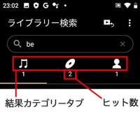 検索結果が「曲名」「アルバム名」「アーティスト名」ごとに分けられて表示されるので、それぞれのアイコンをタップし、該当するコンテンツをタップして再生する
