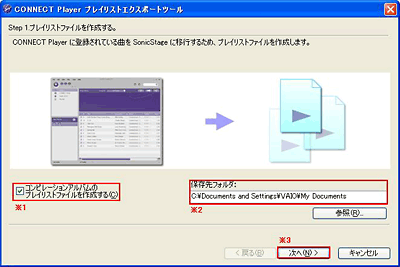 「CONNECT Player プレイリストエクスポートツール」画面で「次へ」をクリックします。 |