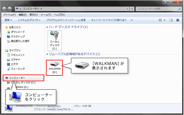 - 画面左側の[コンピューター]もしくは[PC]のアイコンをクリックしてください。「リムーバブル記憶域があるデバイス」として[WALKMAN]が表示されます。