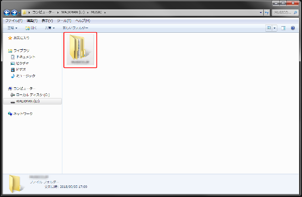 で開いたエクスプローラーのウォークマンの[MUSIC]フォルダー、もしくは、[MUSIC]フォルダー内の音楽別のフォルダーをマウスで左クリックしてください。 - 左クリックしたまま手順
