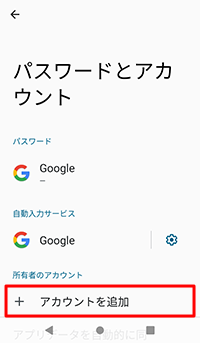 [設定]−[パスワードとアカウント]を選択し、[アカウントを追加]をタップする