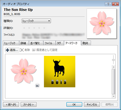 フォーマットがmp3、mp4、flac,aacなどの場合、Media Goのジャケット写真の登録状況によって対処方法が異なります。 Media Goのオーディオプロパティ画面でジャケット写真を確認し、選択してください。