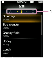 曲やアルバム、アーティスト名を、50音順やアルファベット順で頭文字を選んで、一覧画面の先頭に表示します。インデックスが表示されているときは、ボタン()でカーソルを移動できます。