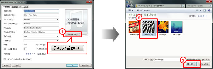 「ファイルを開く」画面で、登録したいジャケット写真用の画像が保存されているフォルダー(マイピクチャ など)を表示し、登録したいジャケット写真の画像を選択してください。