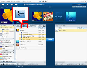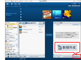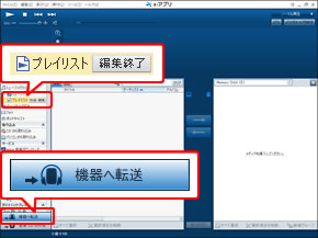 「ライブラリ」より[プレイリスト]を選択してから、[機器へ転送]ボタンをクリックして、接続機器への転送画面を右側に表示してください。