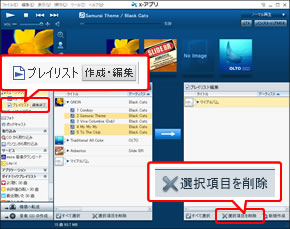 プレイリスト内の楽曲を削除したい場合は、削除したい楽曲を選択してから、[選択項目を削除]ボタンをクリックしてください。