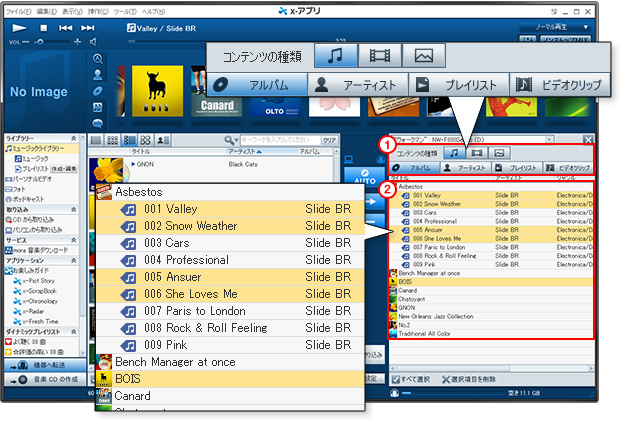画面右側のプルダウンメニューをクリックし、転送先のウォークマンを選択してください。